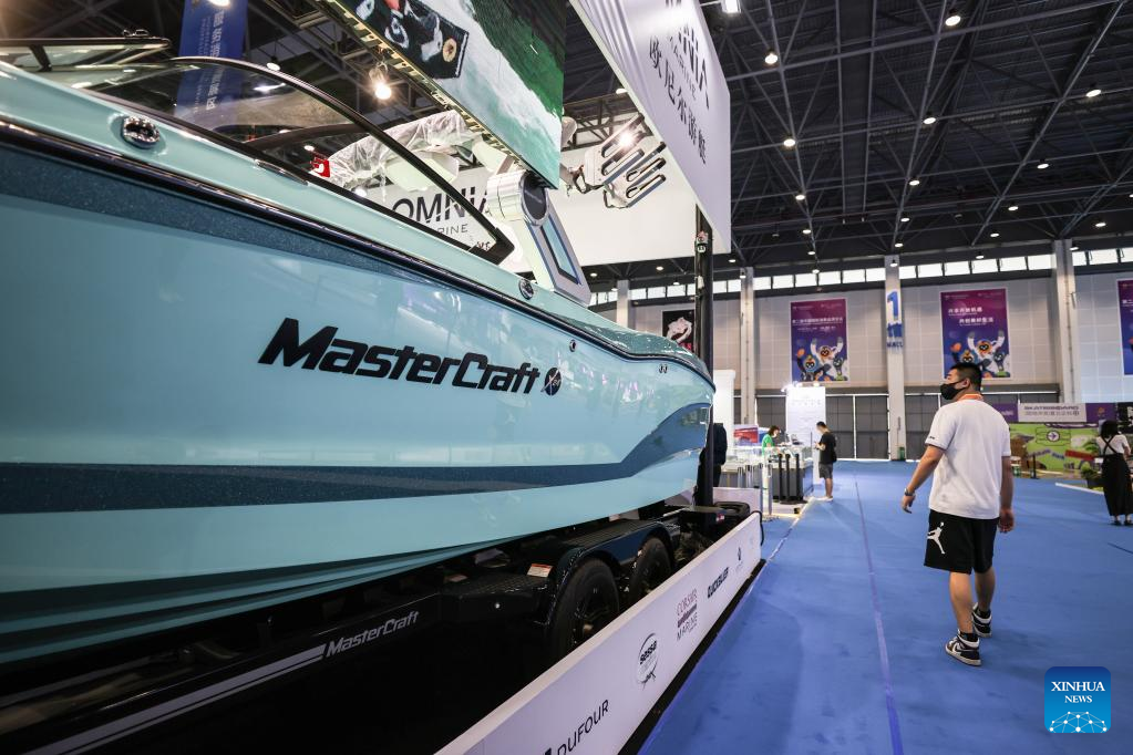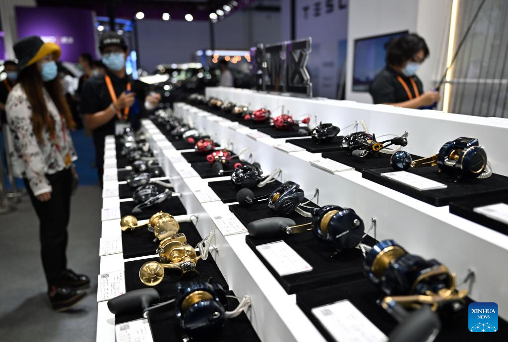 A visitor learns about fishing gear during the second China International Consumer Products Expo in Haikou, south China's Hainan Province, July 25, 2022.
