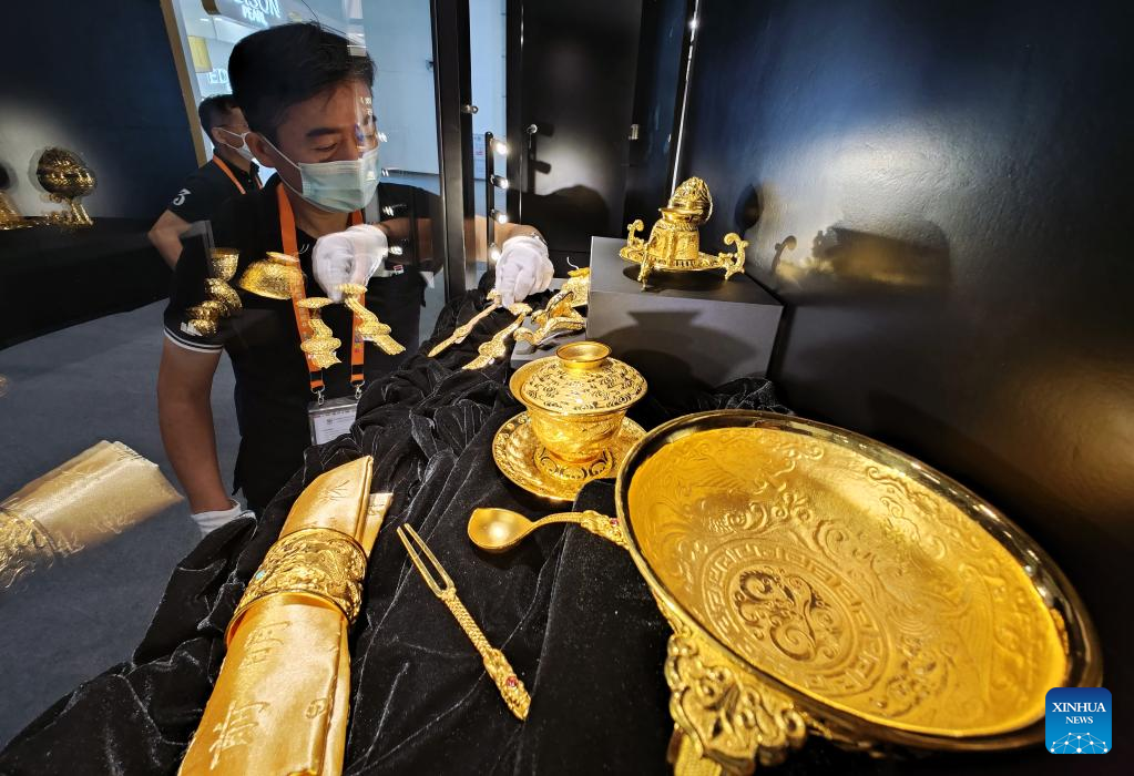 A staff member arranges jewelry exhibits during the second China International Consumer Products Expo in Haikou, south China's Hainan Province, July 25, 2022.