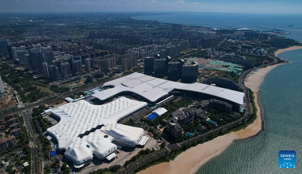 Aerial photo taken on July 25, 2022 shows the Hainan International Convention and Exhibition Center, the venue for the second China International Consumer Products Expo, in Haikou, south China's Hainan Province.