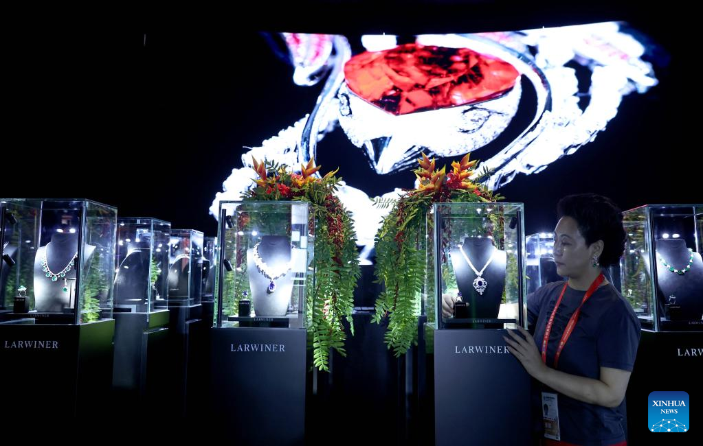 A staff member arranges jewelry exhibits during the second China International Consumer Products Expo in Haikou, south China's Hainan Province, July 25, 2022.(Xinhua/Chen Jianli)