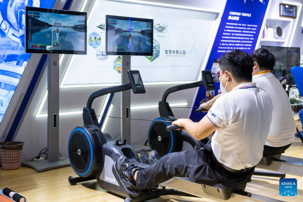 Exhibitors show how to operate rowing machines during the second China International Consumer Products Expo in Haikou, south China's Hainan Province, July 25, 2022.