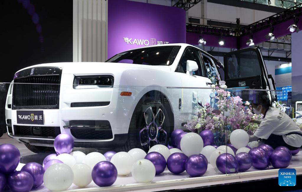 An automobile exhibitor arranges the booth during the second China International Consumer Products Expo in Haikou, south China's Hainan Province, July 25, 2022.