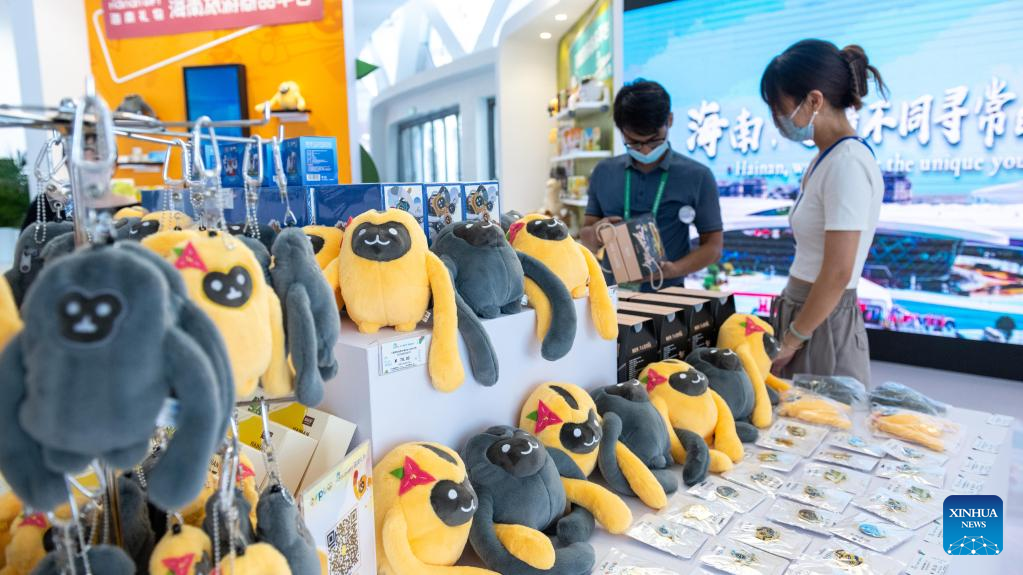 A staff member introduces souvenirs of the second China International Consumer Products Expo during the expo in Haikou, south China's Hainan Province, July 25, 2022.