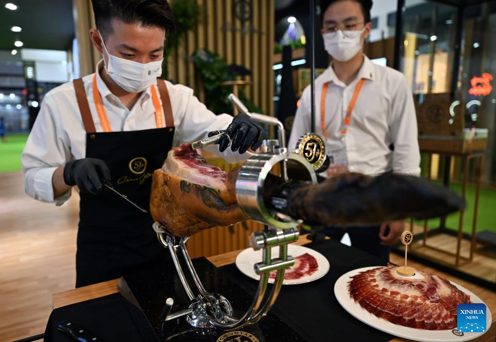 An exhibitor takes a slice of Spanish ham during the second China International Consumer Products Expo in Haikou, south China's Hainan Province, July 25, 2022.