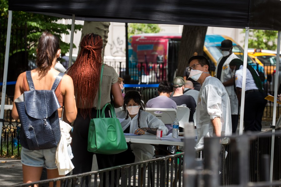 People wait to be vaccinated at a monkeypox vaccination site in New York, the United States, on July 14, 2022. (Photo by Michael Nagle/Xinhua)