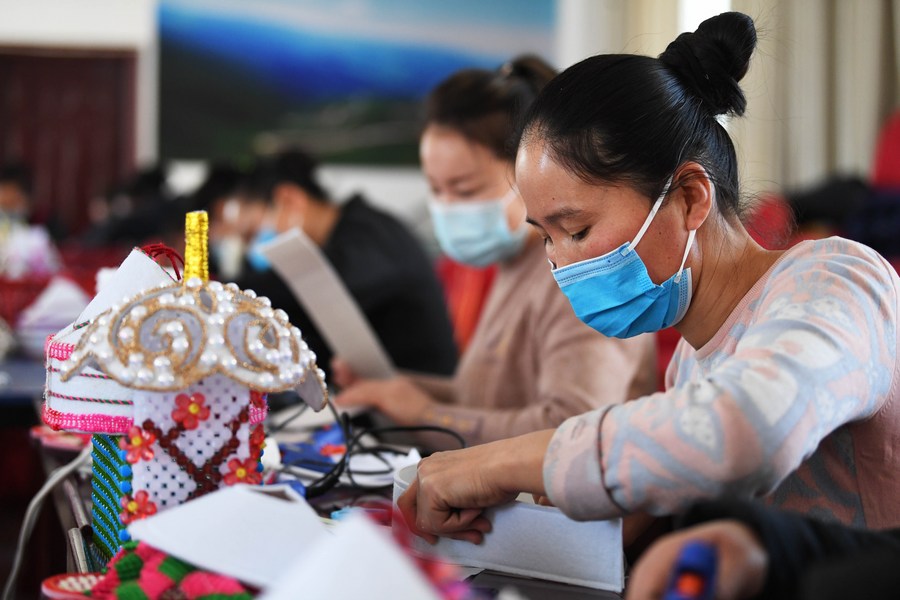 Villagers learn to make handcrafts at Kurti Village, Sarhulsun Township, Altay City of Northwest China's Xinjiang Uygur autonomous region, Jan 30, 2021. [Photo/Xinhua]