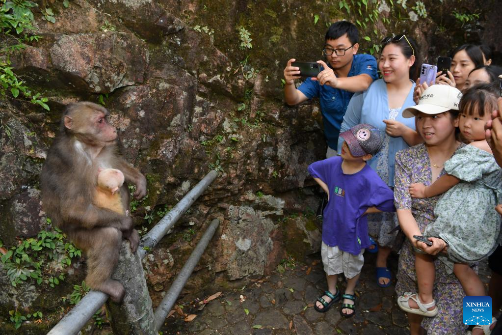 Tourists take photos of Tibetan macaques in the Wuyishan National Park, southeast China's Fujian Province, July 24, 2022.
