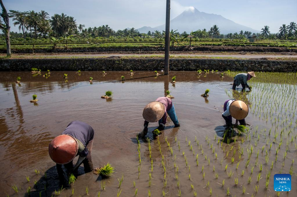 Farmers work in a paddy field near Mount Merapi at Cangkringan Village in Sleman district, Yogyakarta, Indonesia, July 26, 2022. (Photo by Agung Supriyanto/Xinhua)