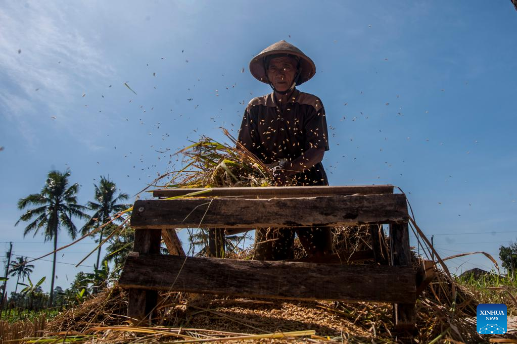 A farmer separates rice from straws in a paddy field near Mount Merapi at Cangkringan Village in Sleman district, Yogyakarta, Indonesia, July 26, 2022. (Photo by Agung Supriyanto/Xinhua)