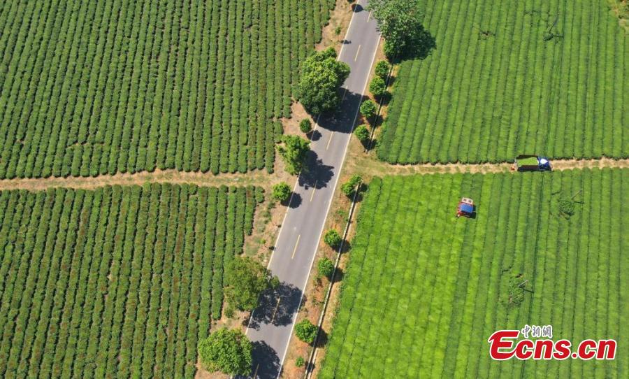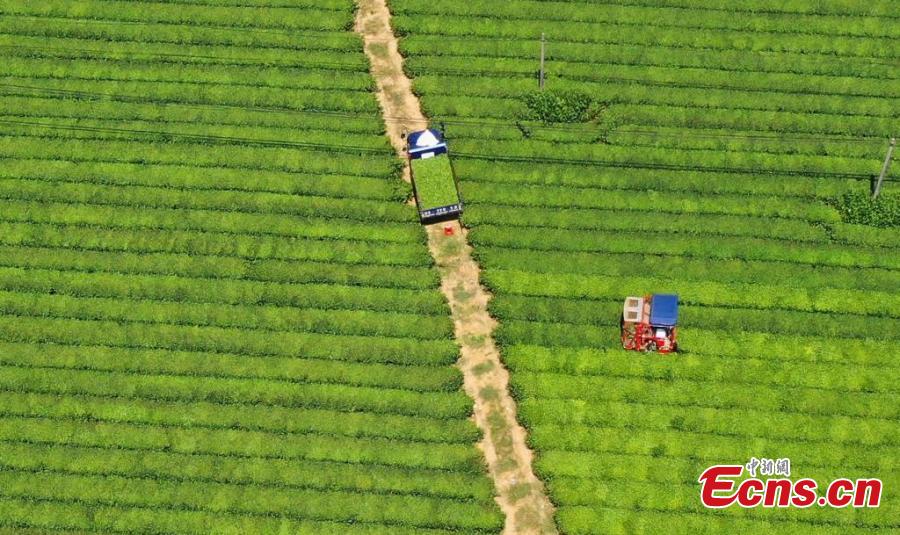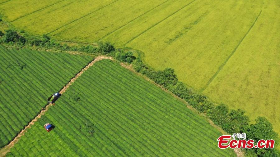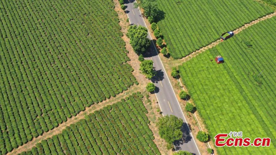 A tea harvester works at a tea plantation in Taihe county of Ji'an city, east China's Jiangxi Province, July 25, 2022. Jiangxi has seen mechanized tea harvesting in recent years. (Photo: China News Service/Deng Heping)