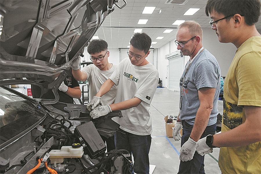 Recruits are instructed at a new energy vehicle training center at a Volkswagen plant in Hefei, Anhui province. [HAN SUYUAN/CHINA NEWS SERVICE]