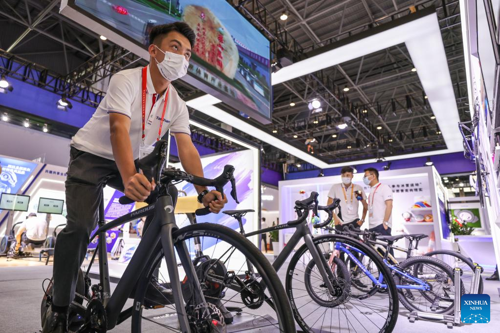 An exhibitor demonstrates a bicycle at the second China International Consumer Products Expo (CICPE) in Haikou, south China's Hainan Province, July 26, 2022. The expo showcases over 2,800 brands from home and abroad. (Xinhua/Zhang Liyun)