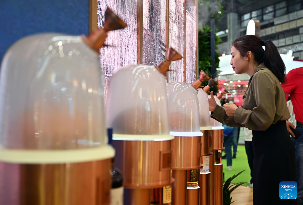 A visitor smells the aroma from a whisky evaporator at the second China International Consumer Products Expo (CICPE) in Haikou, south China's Hainan Province, July 26, 2022. The expo showcases over 2,800 brands from home and abroad. (Xinhua/Guo Cheng)