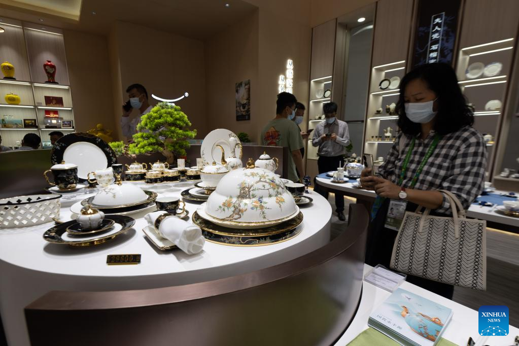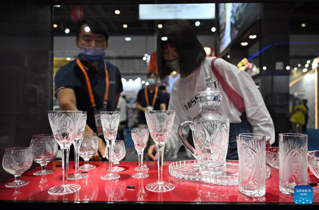 Visitors view crystal tableware at the second China International Consumer Products Expo (CICPE) in Haikou, south China's Hainan Province, July 27, 2022. The expo showcases over 2,800 brands from home and abroad. (Xinhua/Guo Cheng)