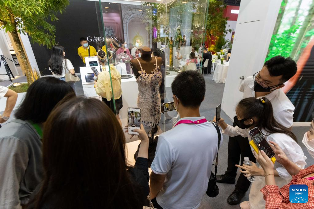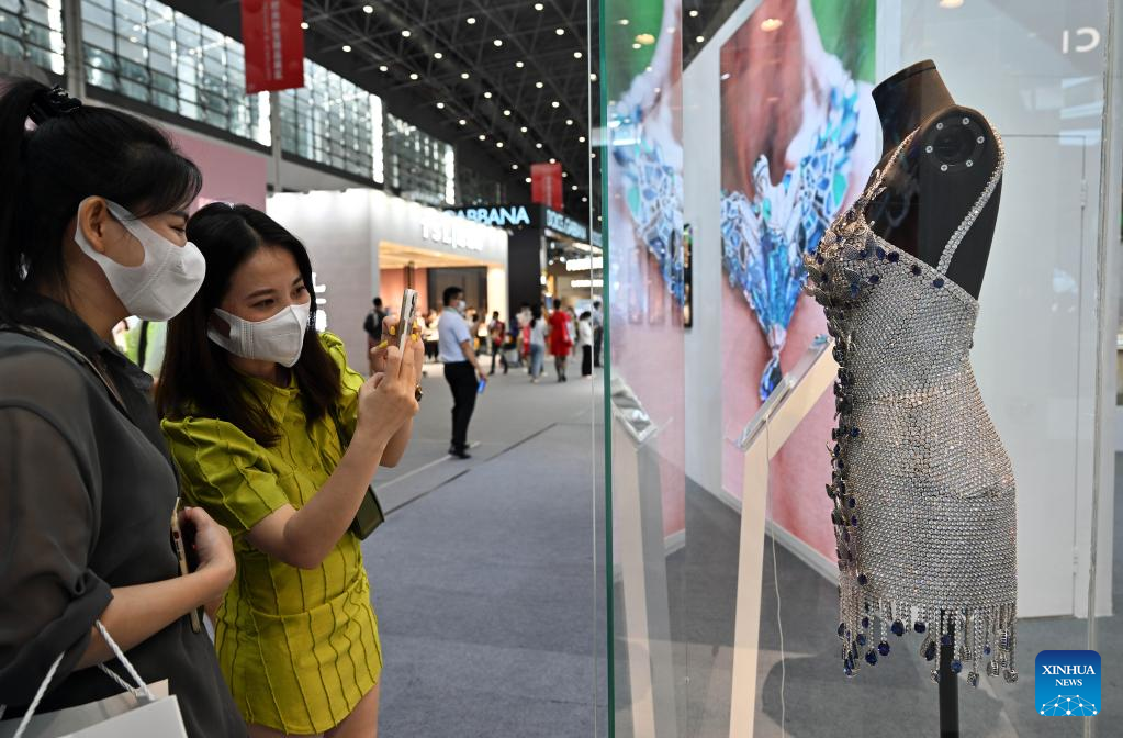 Visitors view a dress made of 19,650 artificial gems at the second China International Consumer Products Expo (CICPE) in Haikou, south China's Hainan Province, July 27, 2022. The expo showcases over 2,800 brands from home and abroad. (Xinhua/Guo Cheng)