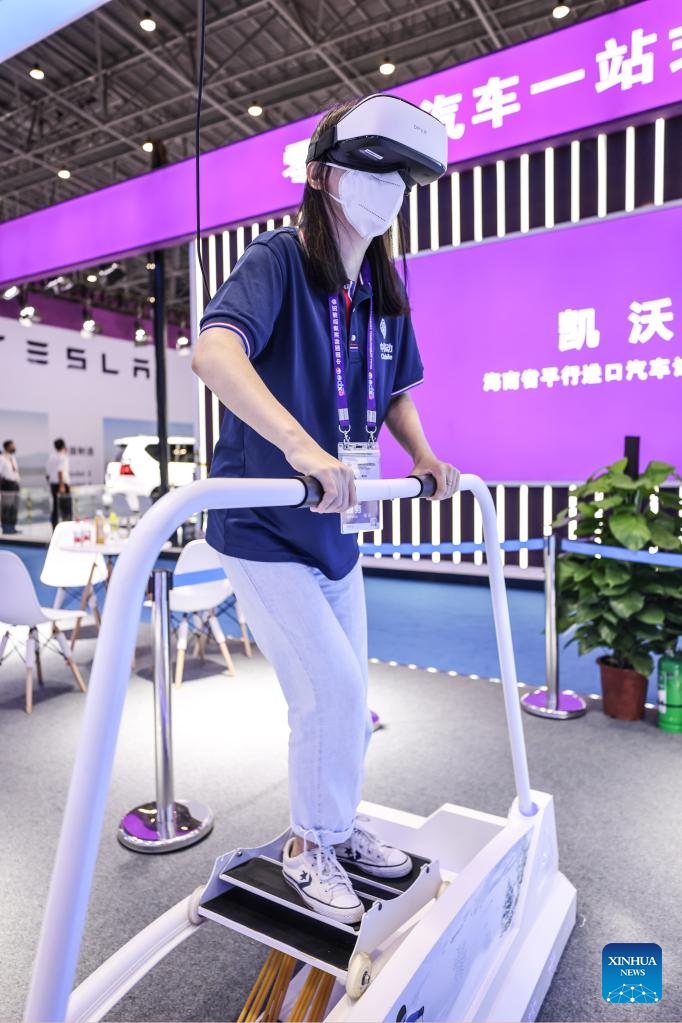 A visitor experiences a new interactive video-shooting equipment at the second China International Consumer Products Expo (CICPE) in Haikou, south China's Hainan Province, July 27, 2022. The expo showcases over 2,800 brands from home and abroad. (Xinhua/Yang Guanyu)