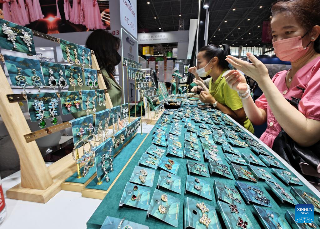 Visitors view jewelry at the second China International Consumer Products Expo (CICPE) in Haikou, south China's Hainan Province, July 27, 2022. The expo showcases over 2,800 brands from home and abroad. (Xinhua/Guo Cheng)