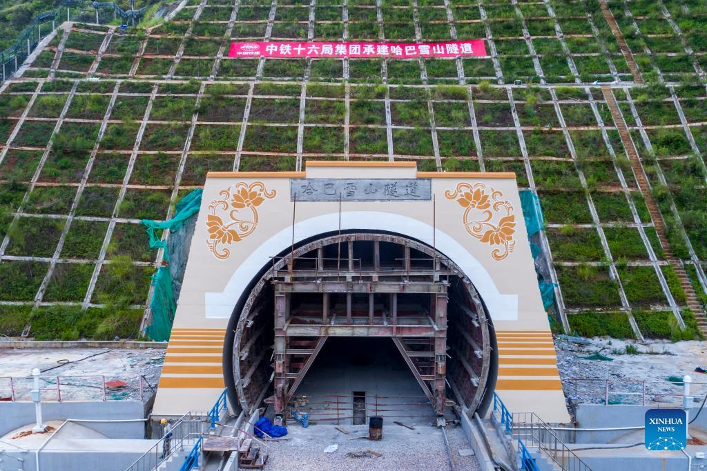 Aerial photo taken on July 26, 2022 shows the entrance of the Haba Snow Mountain tunnel along the Lijiang-Shangri-La railway in southwest China's Yunnan Province. With a designed speed of 120 kilometers per hour, the 140-kilometer Lijiang-Shangri-La railway is expected to shorten the travel time between Lijiang and Shangri-La after its operation. (Xinhua/Chen Xinbo)