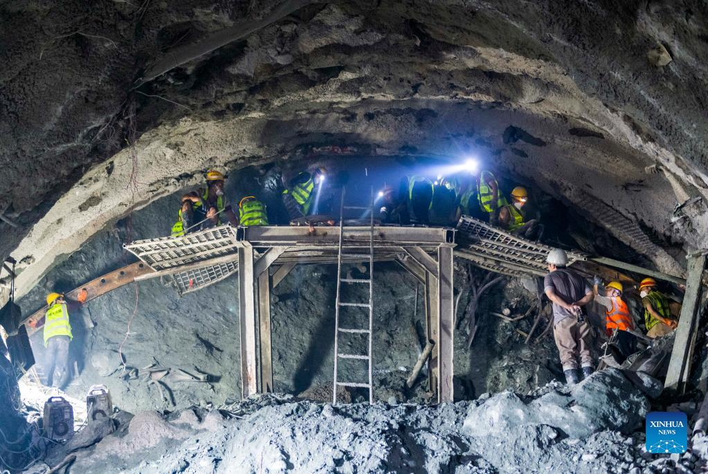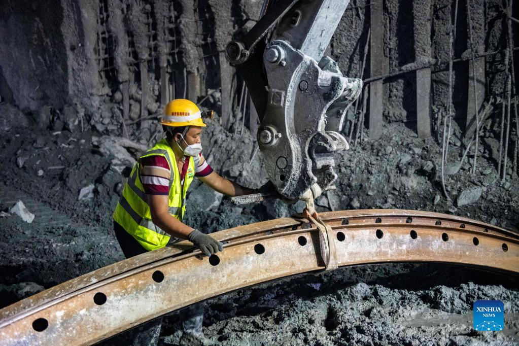 Workers operate at the construction site of the Haba Snow Mountain tunnel along the Lijiang-Shangri-La railway in southwest China's Yunnan Province, July 27, 2022. With a designed speed of 120 kilometers per hour, the 140-kilometer Lijiang-Shangri-La railway is expected to shorten the travel time between Lijiang and Shangri-La after its operation. (Xinhua/Chen Xinbo)