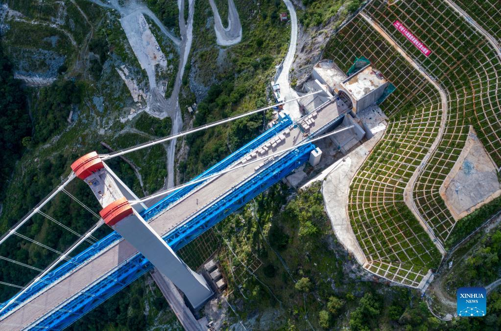 Aerial photo taken on July 27, 2022 shows the Jinsha River grand bridge linked with the entrance of the Haba Snow Mountain tunnel along the Lijiang-Shangri-La railway in southwest China's Yunnan Province. With a designed speed of 120 kilometers per hour, the 140-kilometer Lijiang-Shangri-La railway is expected to shorten the travel time between Lijiang and Shangri-La after its operation. (Xinhua/Chen Xinbo)