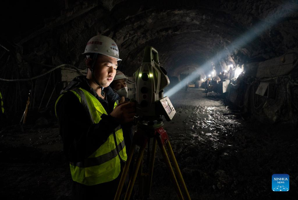 Workers conduct survey at the construction site of the Haba Snow Mountain tunnel along the Lijiang-Shangri-La railway in southwest China's Yunnan Province, July 27, 2022. With a designed speed of 120 kilometers per hour, the 140-kilometer Lijiang-Shangri-La railway is expected to shorten the travel time between Lijiang and Shangri-La after its operation. (Xinhua/Chen Xinbo)