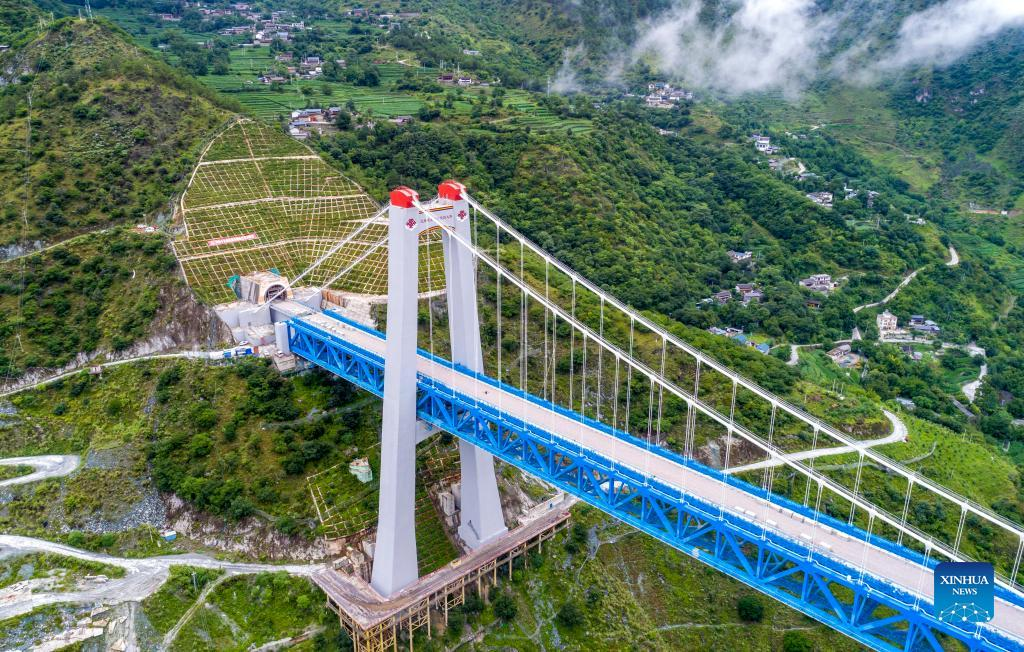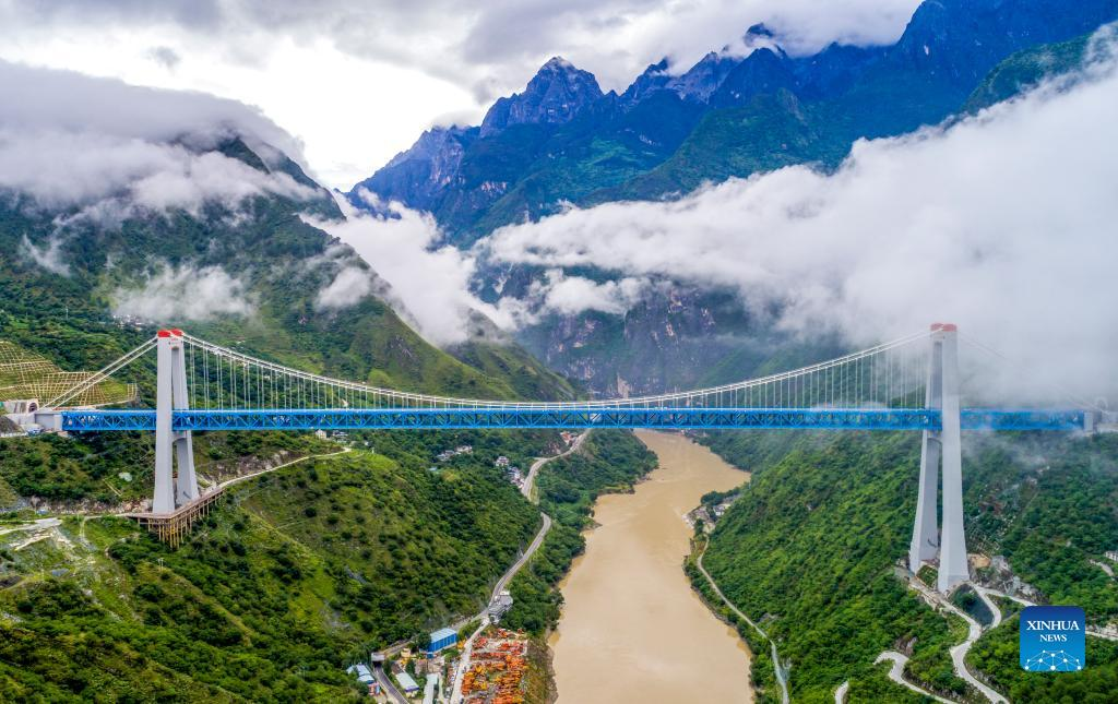 Aerial photo taken on July 27, 2022 shows a view of the Jinsha River grand bridge along the Lijiang-Shangri-La railway in southwest China's Yunnan Province. With a designed speed of 120 kilometers per hour, the 140-kilometer Lijiang-Shangri-La railway is expected to shorten the travel time between Lijiang and Shangri-La after its operation. (Xinhua/Chen Xinbo)