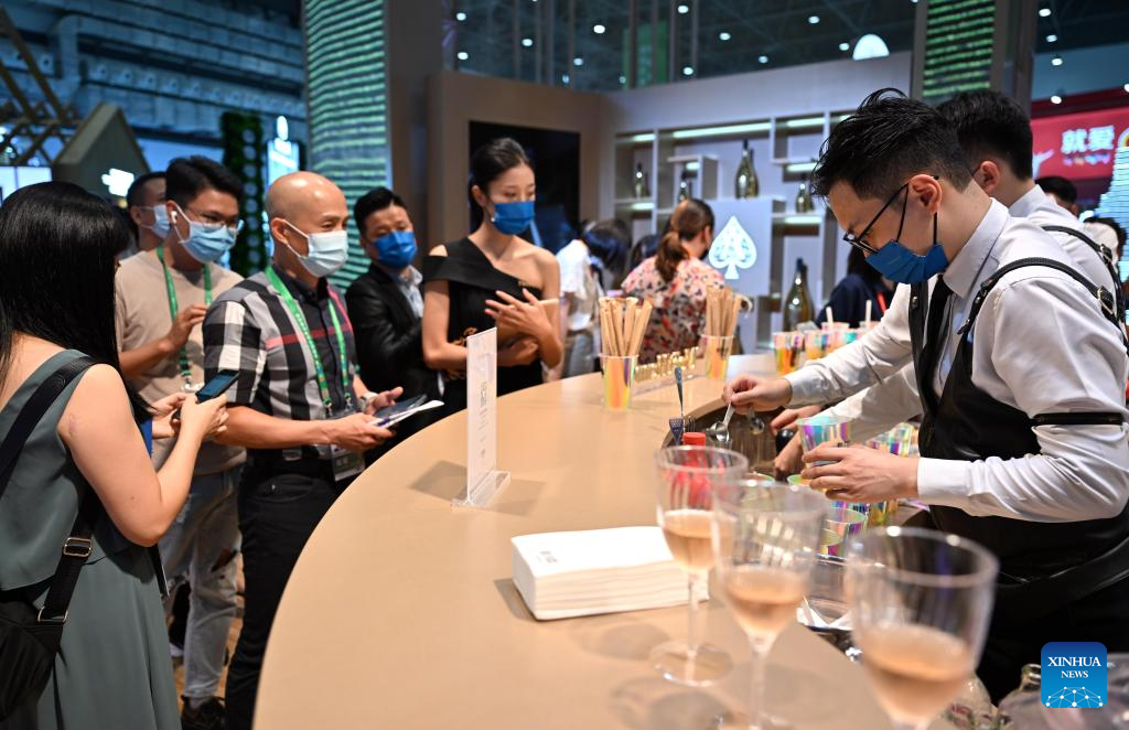 Staff members prepare cocktails for visitors in the French pavilion at the second China International Consumer Products Expo (CICPE) in Haikou, south China's Hainan Province, July 26, 2022. There are about 50 French companies and nearly 250 French brands participating in the expo being held on the resort island of Hainan. France is the guest of honor country at this year's CICPE and, besides China, the largest exhibitor. (Xinhua/Guo Cheng)