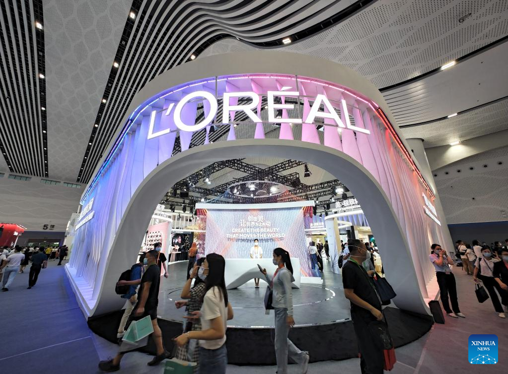 Photo taken on July 26, 2022 shows the booth of cosmetics giant L'Oreal in the French pavilion at the second China International Consumer Products Expo (CICPE) in Haikou, south China's Hainan Province. There are about 50 French companies and nearly 250 French brands participating in the expo being held on the resort island of Hainan. France is the guest of honor country at this year's CICPE and, besides China, the largest exhibitor. (Xinhua/Guo Cheng)
