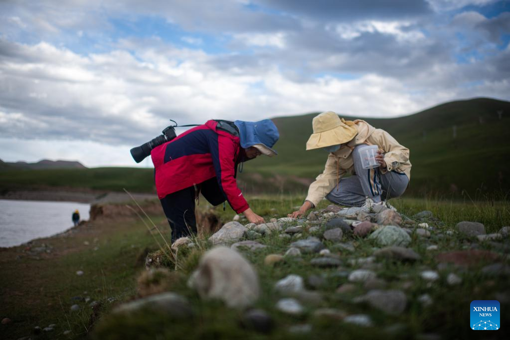 Zhang Guoyue (L) and Fan Yadong, members of a scientific expedition team, collect insect samples from a source of the Yangtze River in northwest China's Qinghai Province, July 26, 2022. Chinese scientists launched an expedition on Sunday in the headwater regions of the Yangtze and Lancang rivers in northwest China's Qinghai Province, to investigate the regions' water resources and ecological environment.
