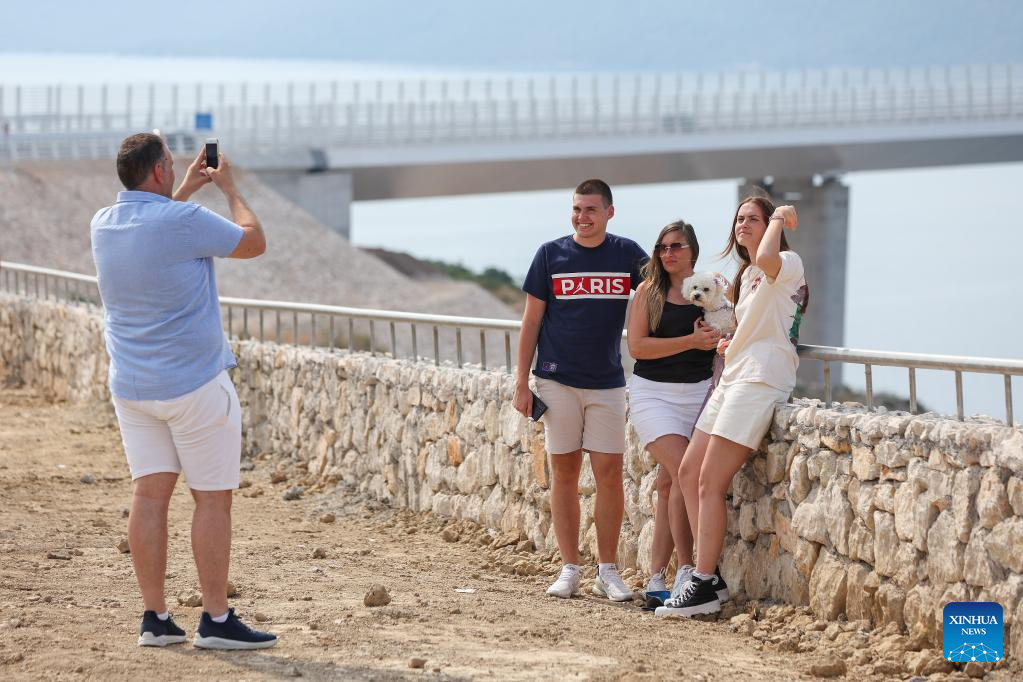 People take photos near the Peljesac Bridge in Komarna, Croatia, July 27, 2022. Croatia's Chinese-built Peljesac Bridge opened Tuesday for transport in the village of Komarna, connecting the two parts of the country's coastline for the first time. (Igor Kralj/PIXSELL via Xinhua)
