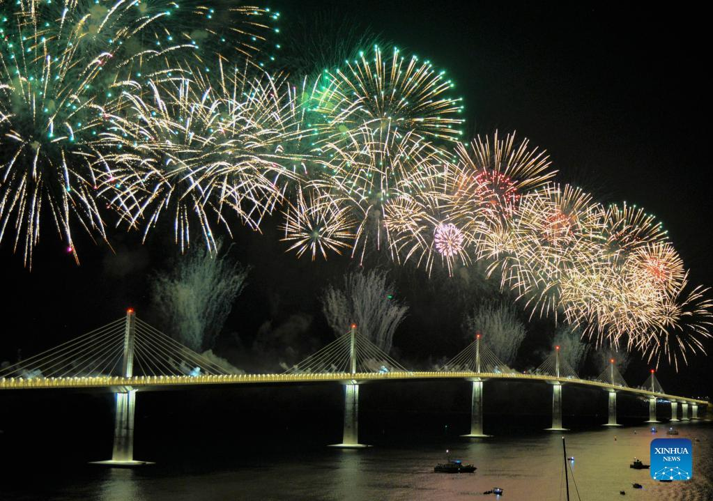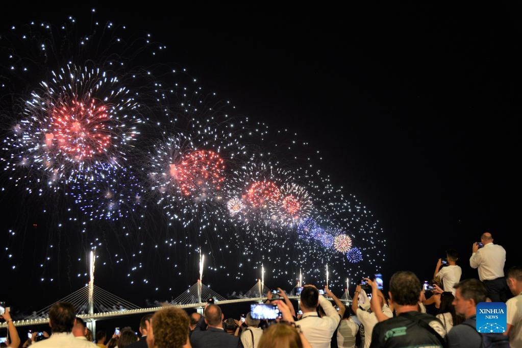 Fireworks are seen during the inauguration ceremony of the Peljesac Bridge in Komarna, Croatia, July 26, 2022. Croatia's Chinese-built Peljesac Bridge opened Tuesday for transport in the village of Komarna, connecting the two parts of the country's coastline for the first time. (Xinhua/Li Xuejun)