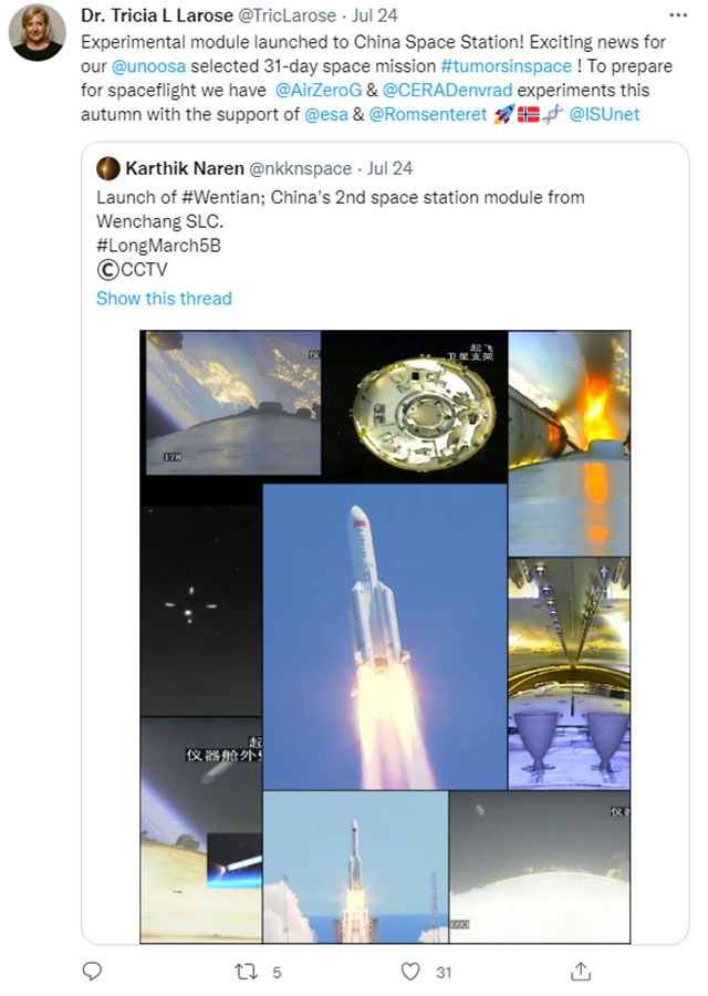 Last week, Tricia L. Larose tweeted that she will board the Chinese space station for a 31-day mission. Larose and her team are implementing a multi-European tumor research program, and the final step is to test their theory on the space station. She is currently training and is expected to board the space station in 2025-2026.