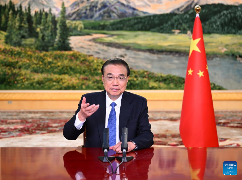 Chinese Premier Li Keqiang speaks while attending the inauguration ceremony of the Chinese-built Peljesac Bridge in Croatia via video link, July 26, 2022. (Xinhua/Zhang Ling)