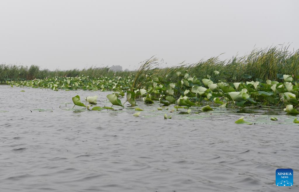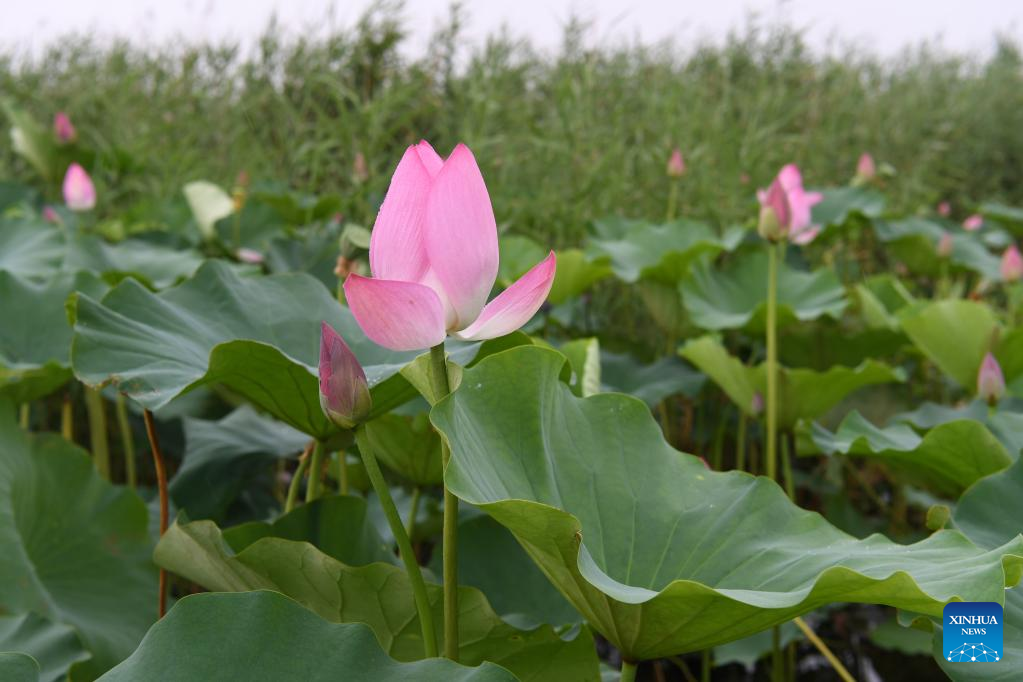 Photo taken on July 27, 2022 shows lotus flowers in Baiyangdian Lake in Xiongan New Area, north China's Hebei Province. Baiyangdian Lake, the largest wetland ecosystem in northern China, has seen significant improvement in its water quality thanks to environmental protection and restoration efforts in recent years. (Xinhua/Zhu Xudong)