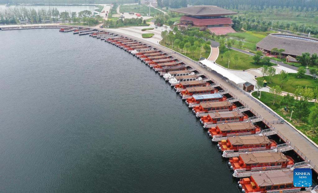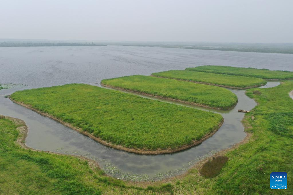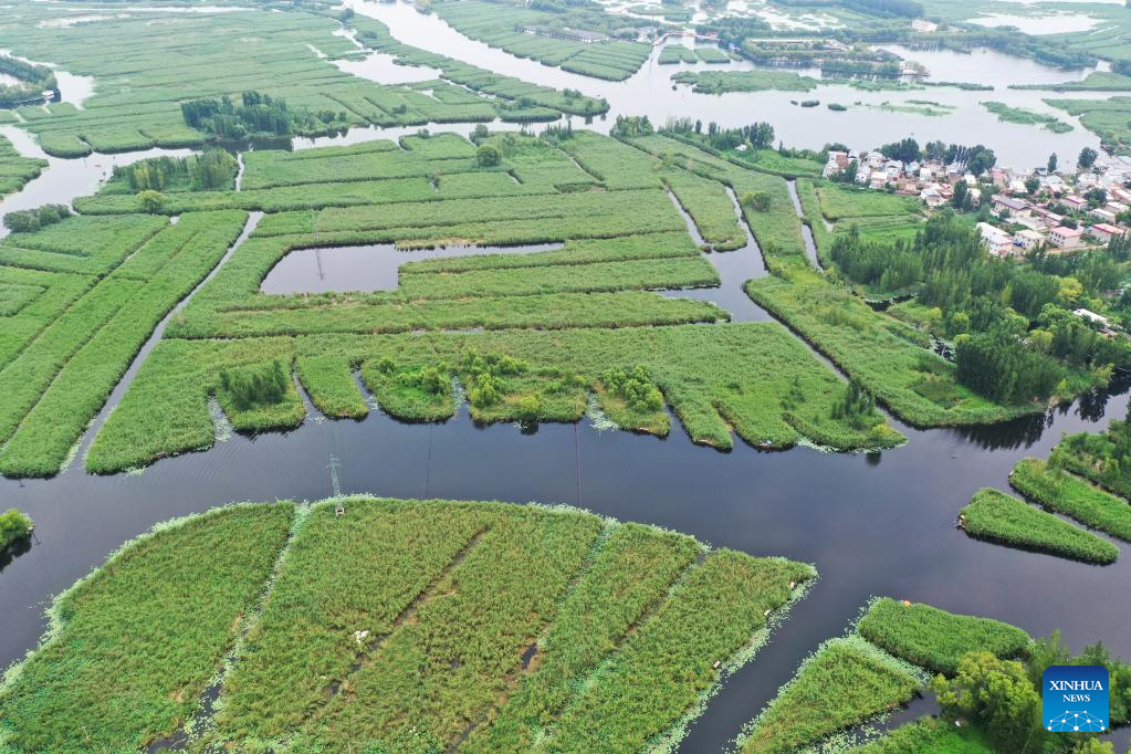 Aerial photo taken on July 27, 2022 shows a wharf of Baiyangdian Lake in Xiongan New Area, north China's Hebei Province. Baiyangdian Lake, the largest wetland ecosystem in northern China, has seen significant improvement in its water quality thanks to environmental protection and restoration efforts in recent years. (Xinhua/Zhu Xudong)