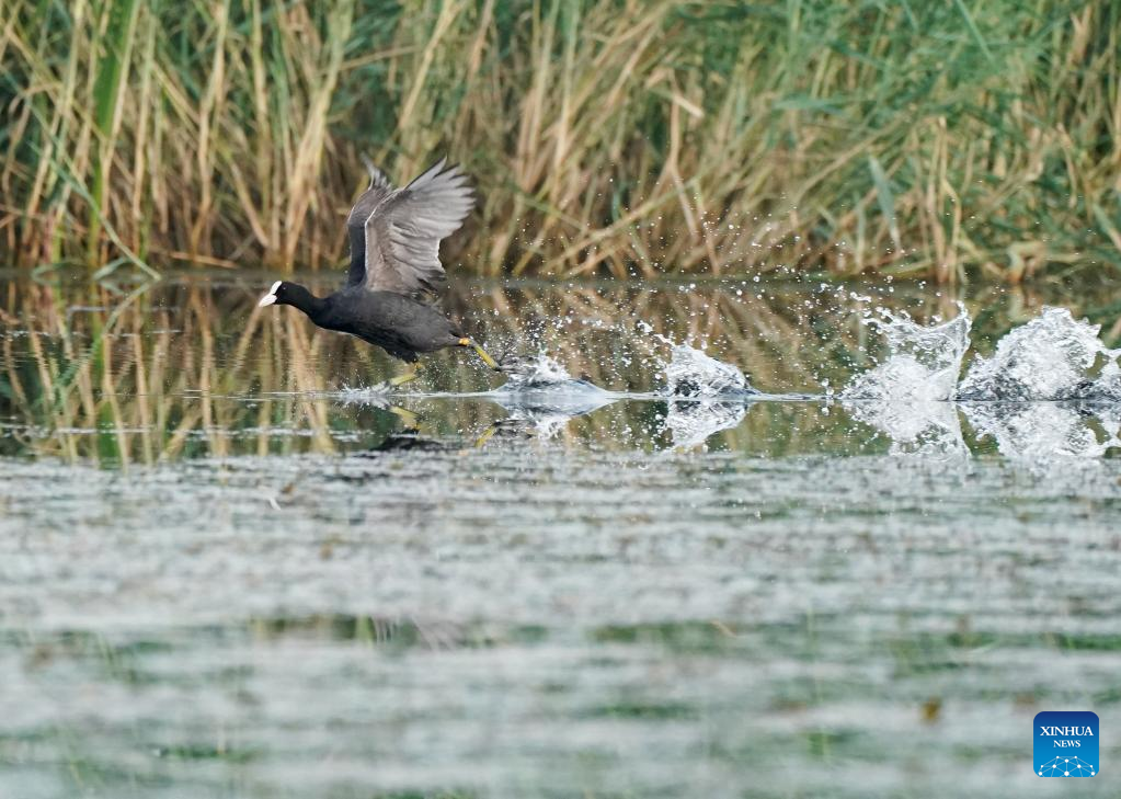 Photo taken on July 22, 2022 shows a Eurasian coot in Baiyangdian Lake in Xiongan New Area, north China's Hebei Province. Baiyangdian Lake, the largest wetland ecosystem in northern China, has seen significant improvement in its water quality thanks to environmental protection and restoration efforts in recent years. (Xinhua/Xing Guangli)