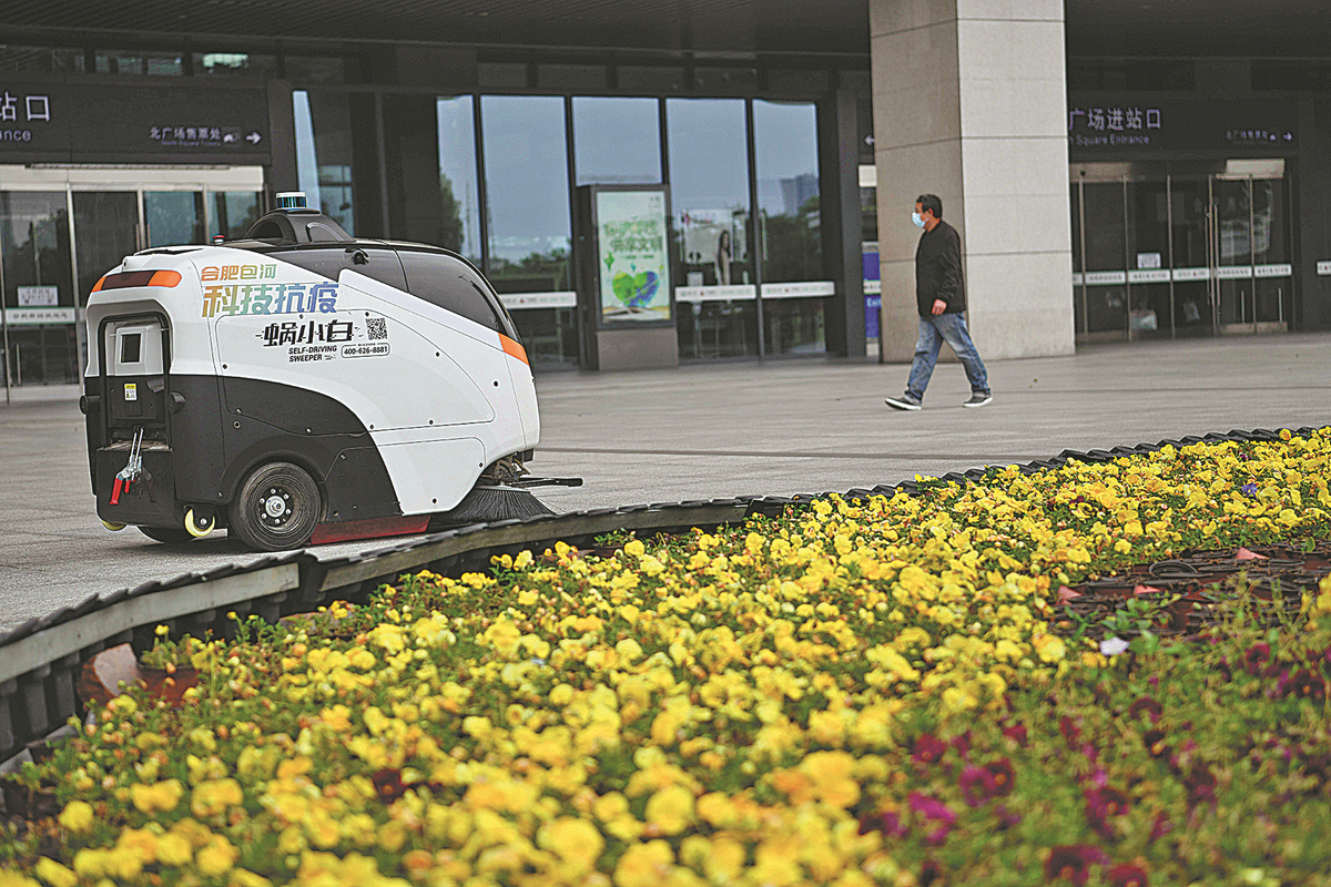 An unmanned sweeper works at Hefei South Railway Station in Hefei, East China's Anhui province, in April. [Photo/Xinhua]