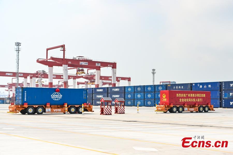 An automated gantry crane loads containers on self-driving trucks at a terminal in the port of Nansha in Guangzhou, south China's Guangdong province, July 28, 2022. (Photo: China News Service/Chen Jimin)