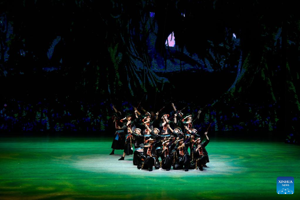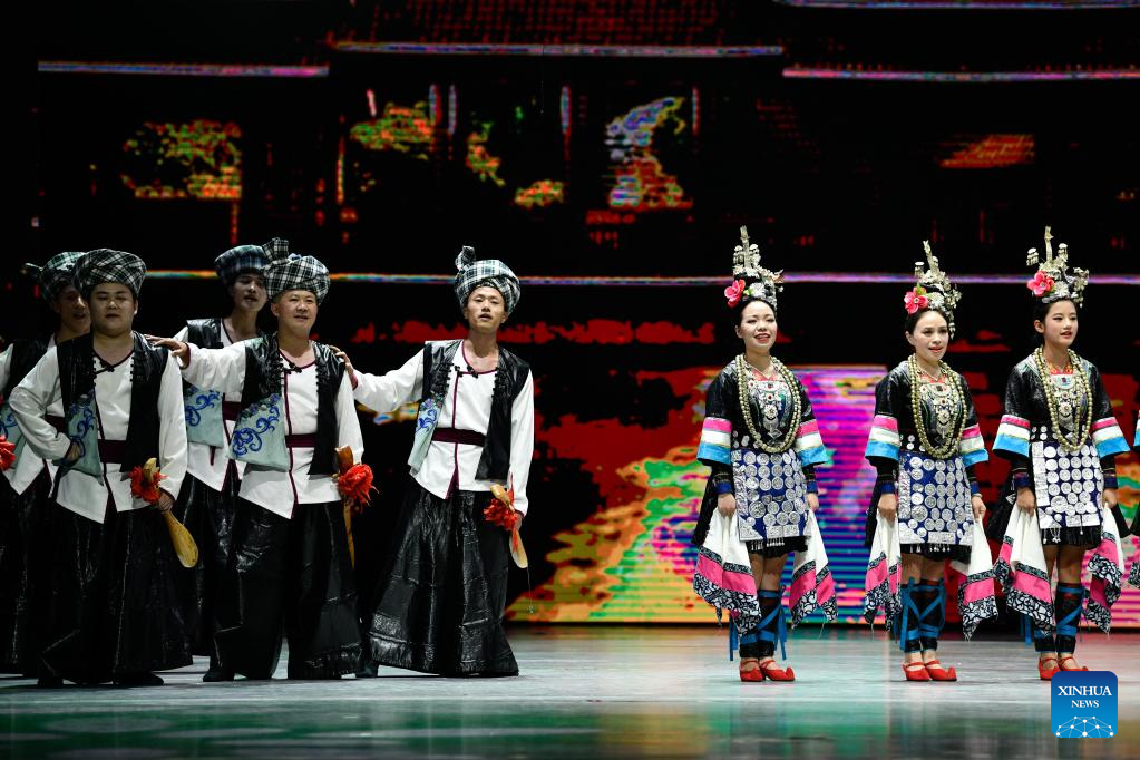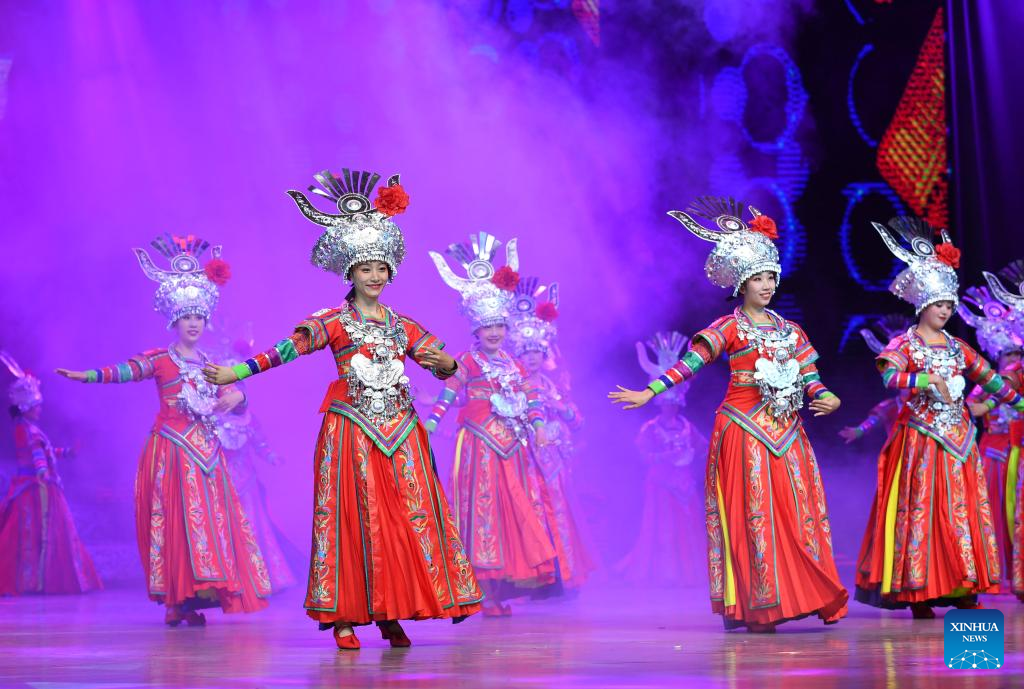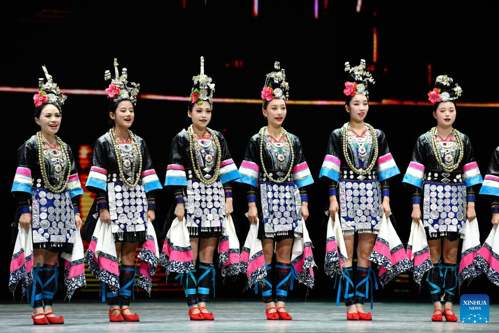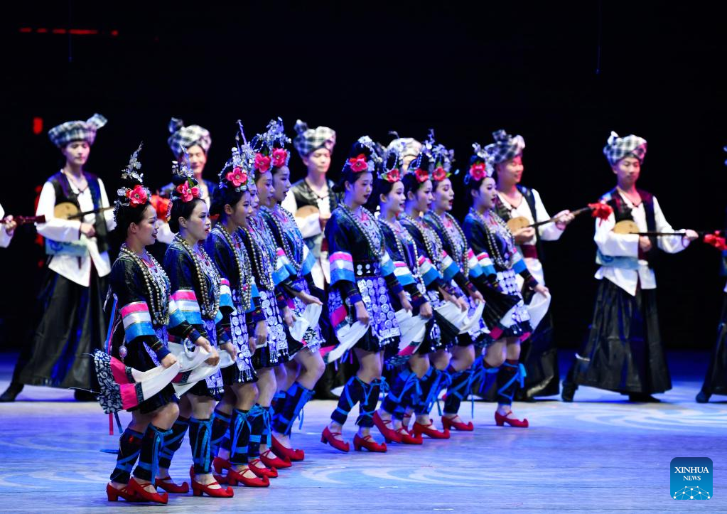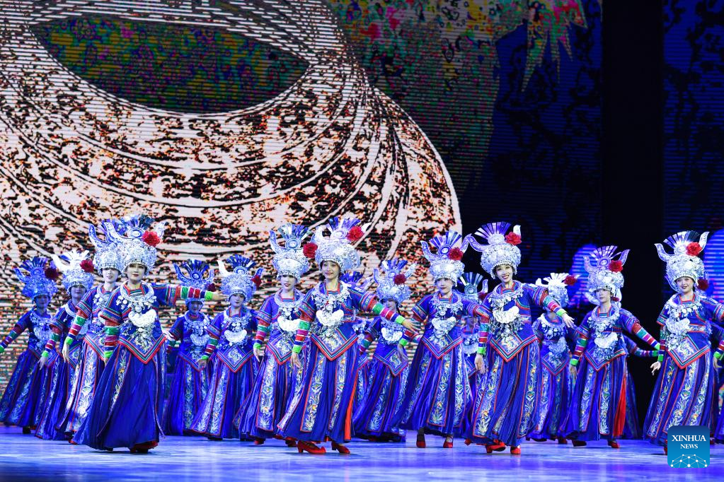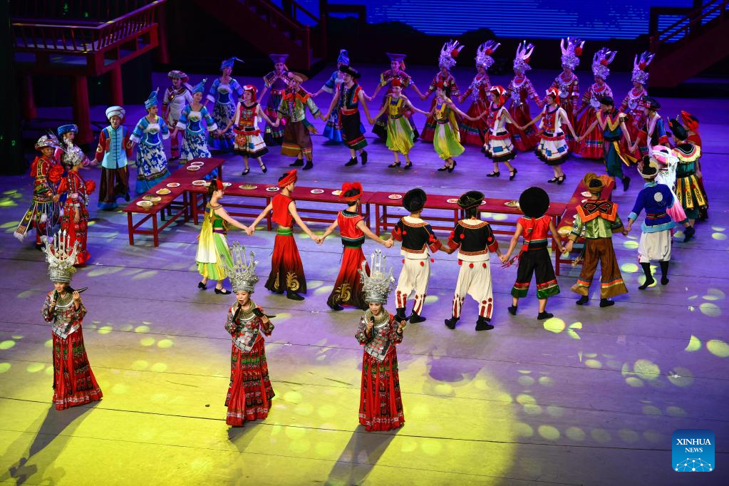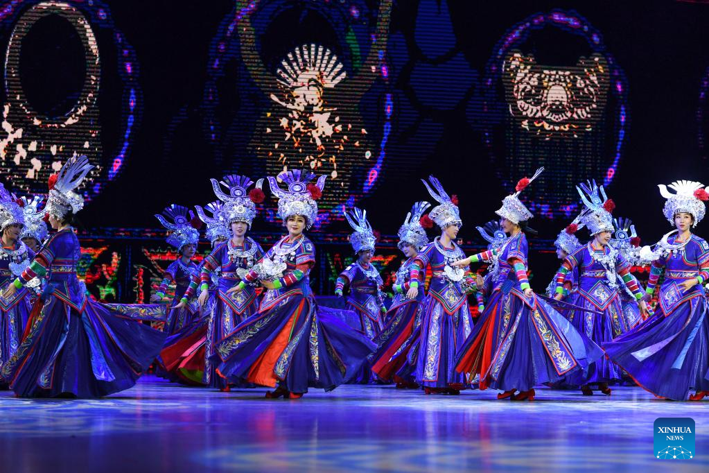 Actors perform in the show "Colorful Guizhou Style" at Guiyang Grand Theatre in Guiyang, southwest China's Guizhou Province, July 30, 2022. Performance of the song and dance show "Colorful Guizhou Style" has recently resumed at Guiyang Grand Theatre.