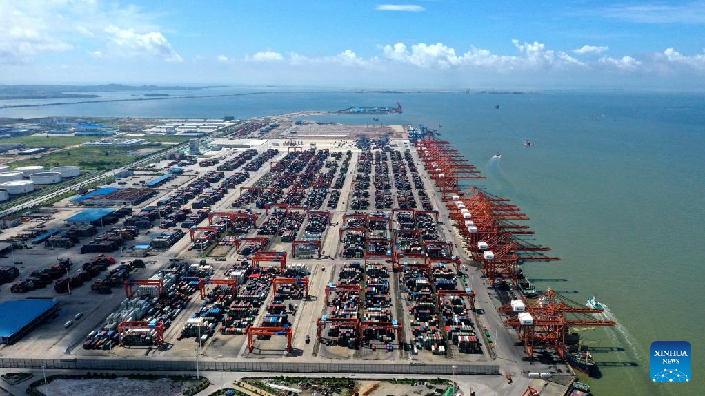 Aerial photo taken on July 9, 2022 shows the container terminal at Qinzhou Port in south China's Guangxi Zhuang Autonomous Region. Launched in 2017, the New International Land-Sea Trade Corridor is a trade and logistics passage jointly built by western Chinese provinces and ASEAN countries. (Xinhua/Zhang Ailin)