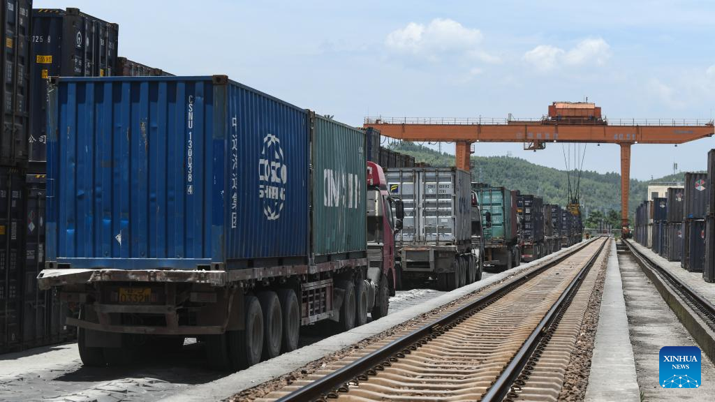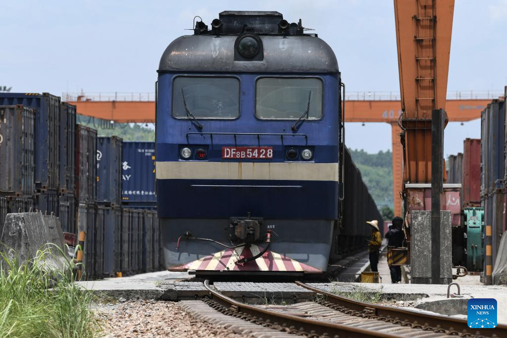 Photo taken on July 29, 2022 shows an outbound freight train at a railway freight center in Wuzhou, south China's Guangxi Zhuang Autonomous Region. Launched in 2017, the New International Land-Sea Trade Corridor is a trade and logistics passage jointly built by western Chinese provinces and ASEAN countries. (Xinhua/Zhang Ailin)