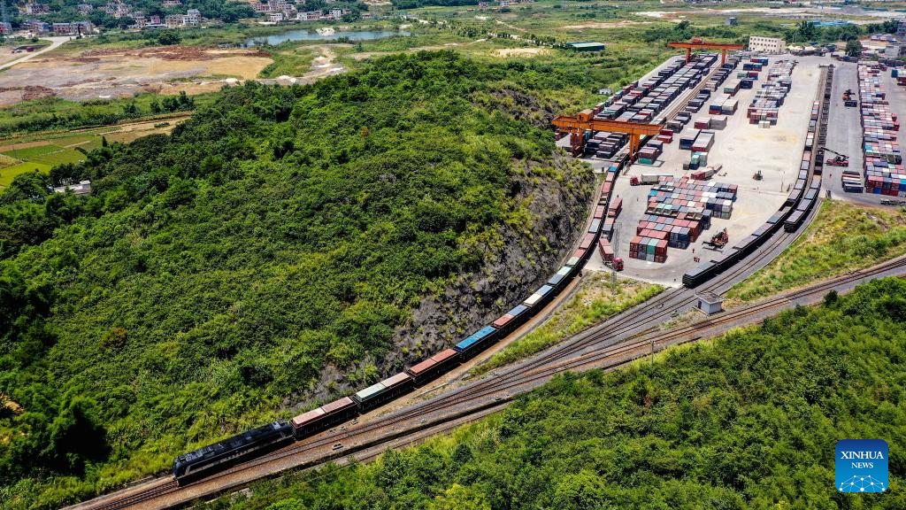 Aerial photo taken on July 29, 2022 shows an outbound freight train at a railway freight center in Wuzhou, south China's Guangxi Zhuang Autonomous Region. Launched in 2017, the New International Land-Sea Trade Corridor is a trade and logistics passage jointly built by western Chinese provinces and ASEAN countries. (Xinhua/Zhang Ailin)