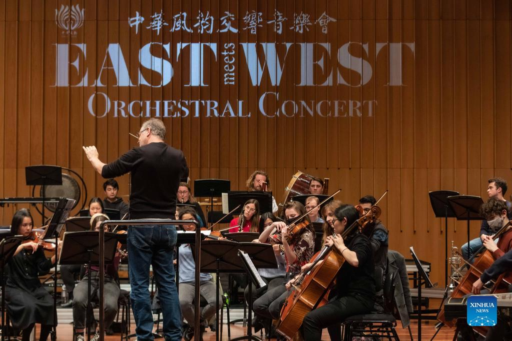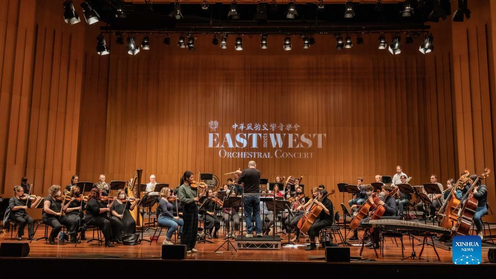 Photo taken on July 30, 2022 shows the opening performance of "Jasmine Flower" by Australian conductor Guy Noble at the "East Meets West" orchestral concert in Llewellyn Hall at the Australian National University in Canberra, Australia. "East Meets West" orchestral concert tour in Australia was held in Canberra on Saturday night. (Photo by Chu Chen/Xinhua)