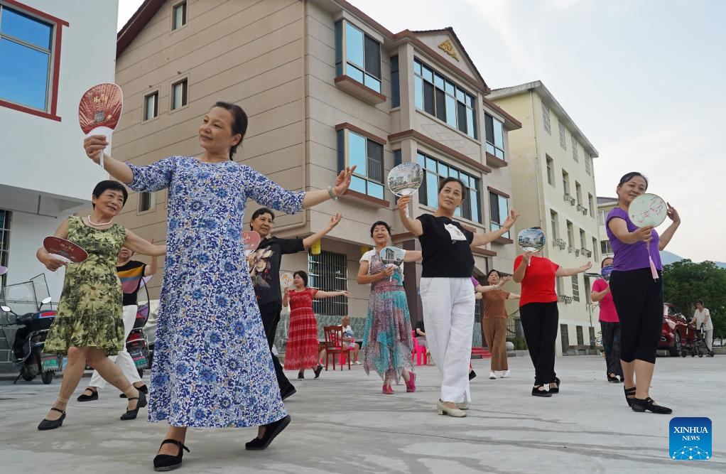 Tourists dance in Sanping Village of Zhongyuan Town in Jing'an County, east China's Jiangxi Province, July 27, 2022.