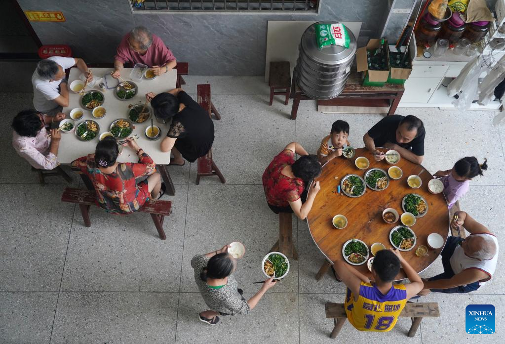 Tourists have dinner in Sanping Village of Zhongyuan Town in Jing'an County, east China's Jiangxi Province, July 27, 2022.