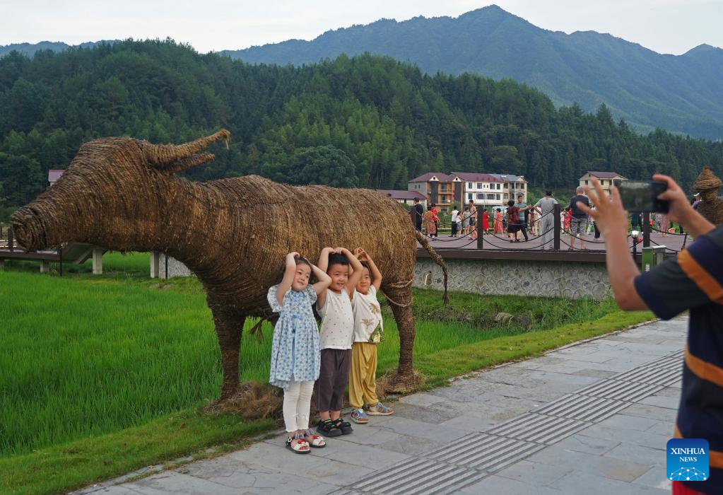 Children pose with a cow-shaped installation work made of twine in Sanping Village of Zhongyuan Town in Jing'an County, east China's Jiangxi Province, July 27, 2022.