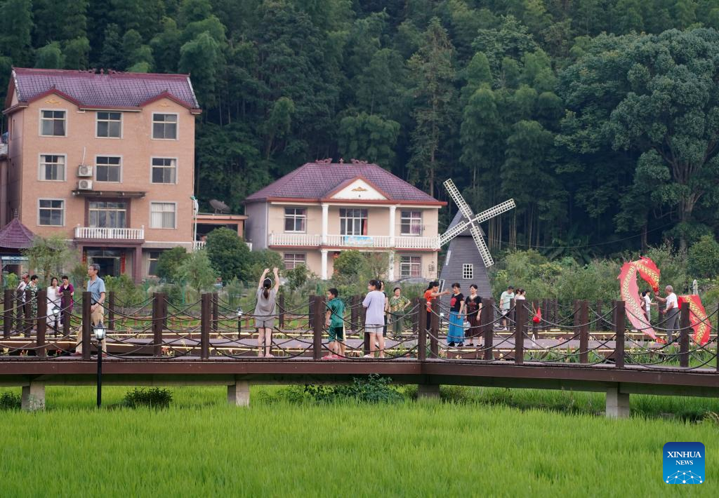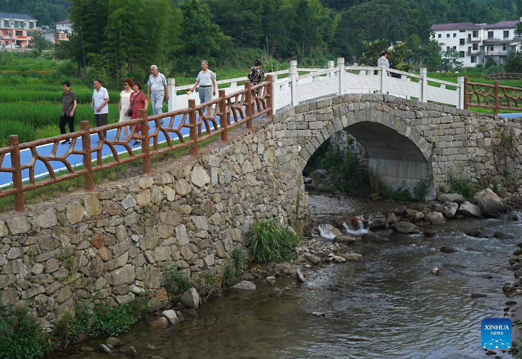 Tourists go for a walk in Sanping Village of Zhongyuan Town in Jing'an County, east China's Jiangxi Province, July 27, 2022.
