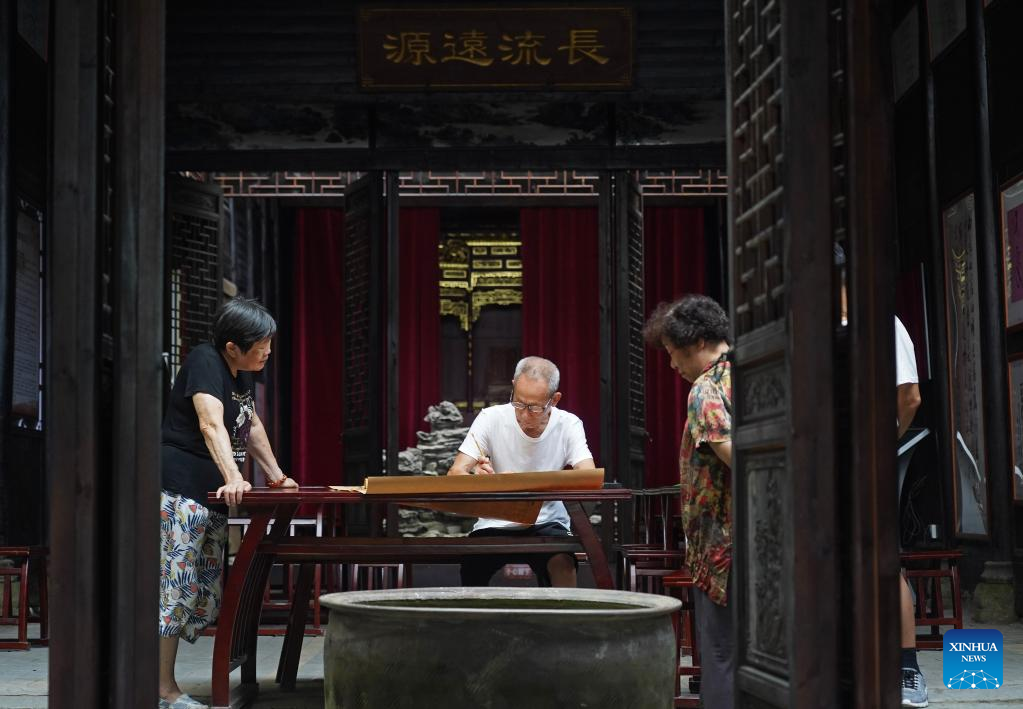 A guest practices calligraphy at an old house in Sanping Village of Zhongyuan Town in Jing'an County, east China's Jiangxi Province, July 27, 2022.