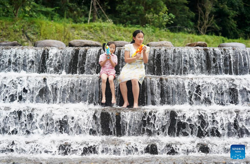 Children play with water guns in Sanping Village of Zhongyuan Town in Jing'an County, east China's Jiangxi Province, July 27, 2022.