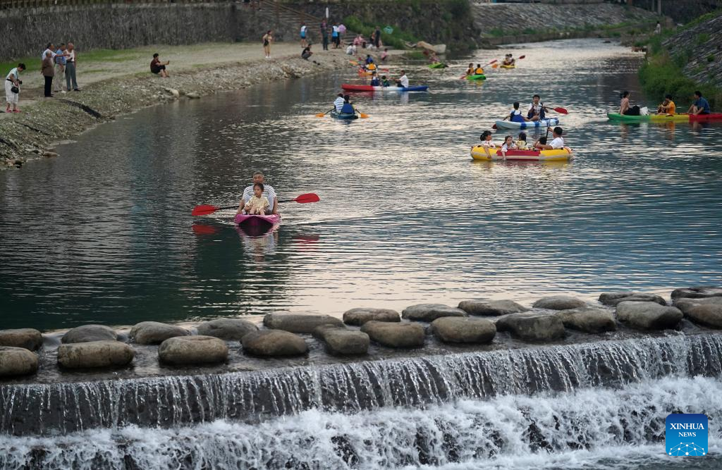Tourists row boats in a brook in Sanping Village of Zhongyuan Town in Jing'an County, east China's Jiangxi Province, July 27, 2022.